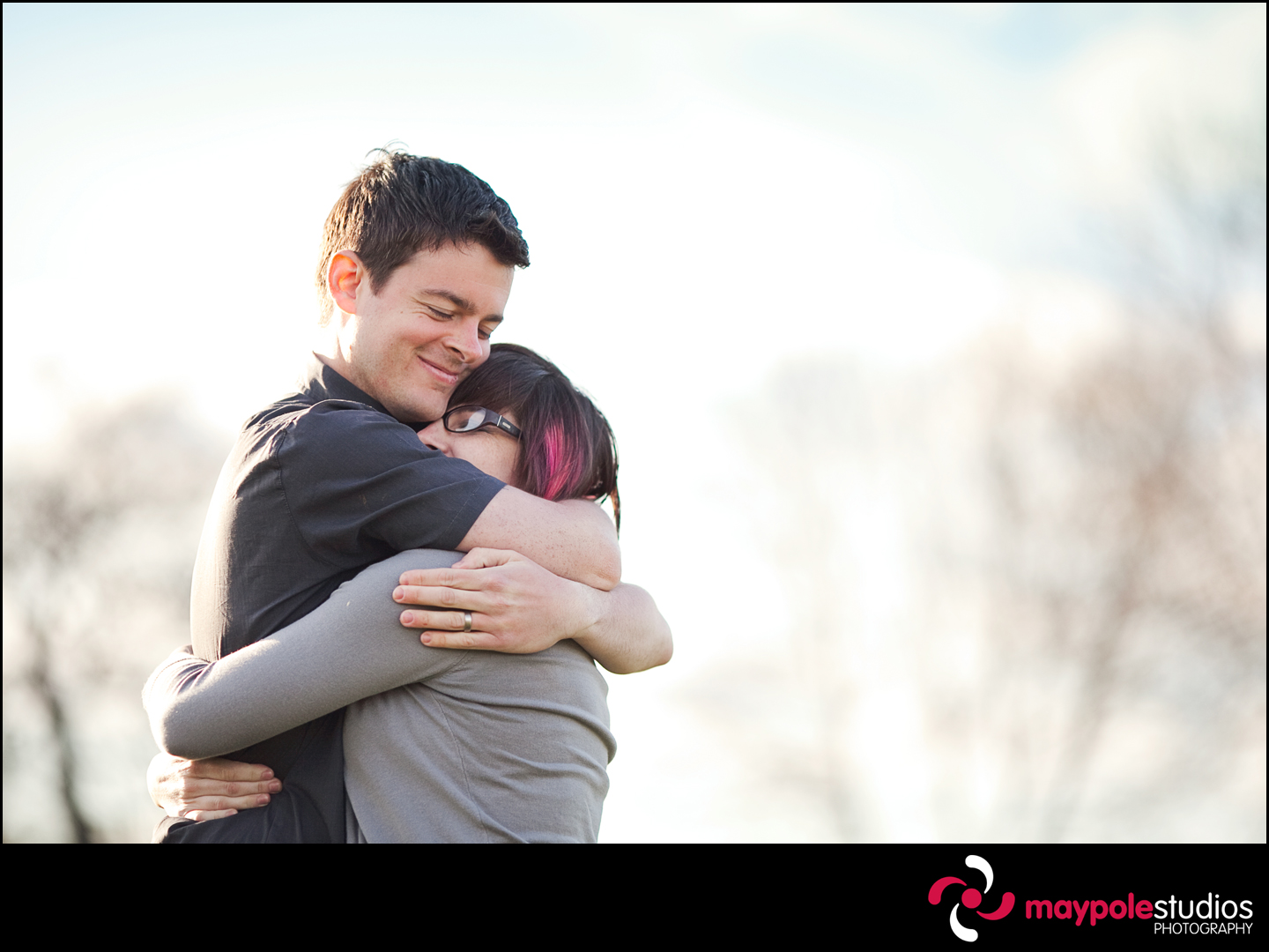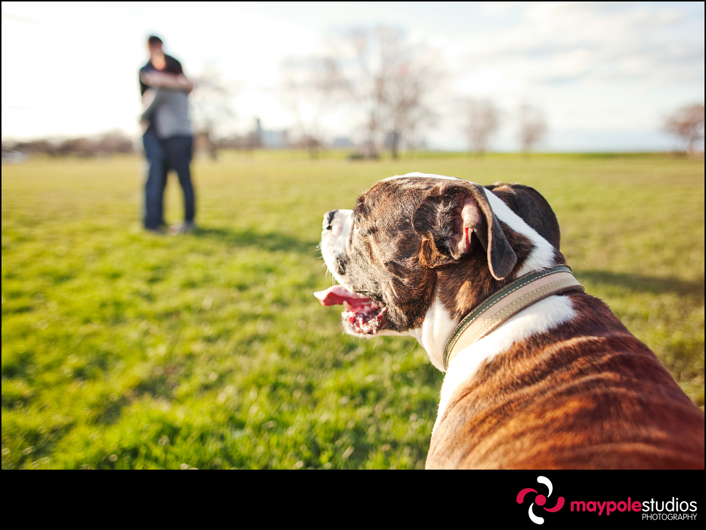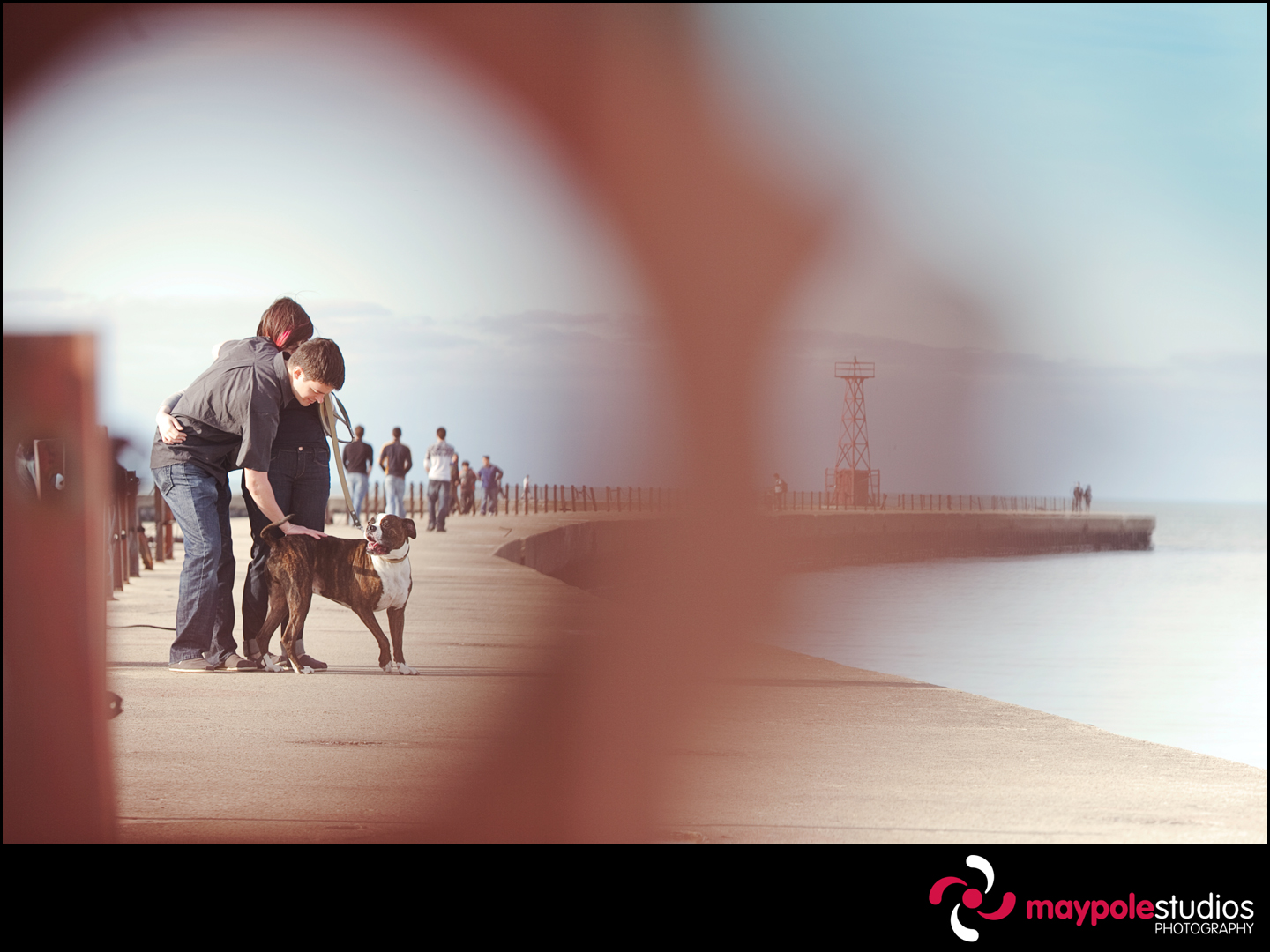 Kaitlyn and Adam met up with me, along with their dog Toby, to walk along Lake Michigan and take some great engagement photos. These two are super cute, from Kaitlyn’s rad pink highlights down to Adam’s comfy Tom’s. They are naturally at ease, barely noticing my camera, they snuggle without coaxing and laugh with sincerity at Toby’s antics. This session was truly as enjoyable and relaxed as an afternoon stroll on a beautiful Spring day. We had a great time hanging out by the Montrose Harbor, then down to Ravenswood, finishing with a beer and some snacks at Bluebird restaurant. Their wedding in October is going to be really special, complete with Toby as the ring bearer!