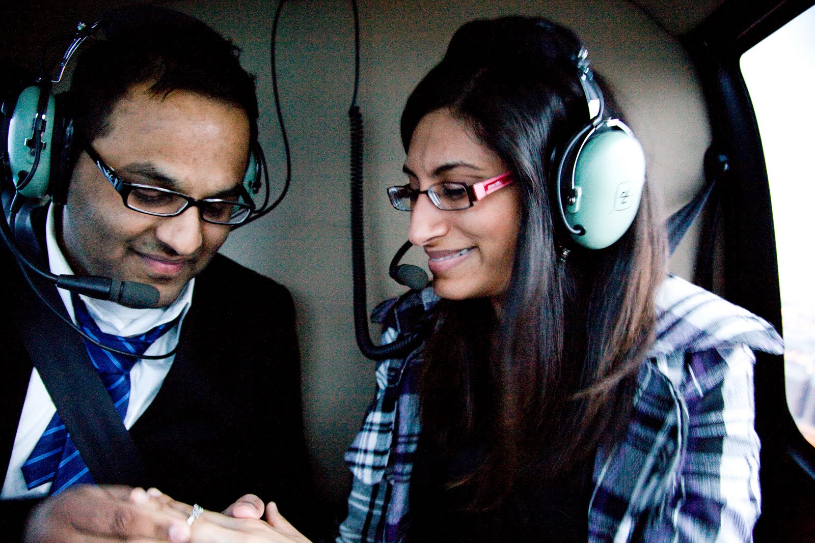 As a wedding photographer I am lucky enough to be a part of some very romantic moments, but this one might take the cake. Under the guise of a photo tourist, I shared a helicopter ride with Ibrahim and Saba while a certain box containing a certain sparkly object lay hidden in his pocket. He had arranged a lovely helicopter ride to tour the city at sunset as an anniversary gift, and she had no idea that I was actually there to document his proposal. Even the soundtrack had been pre-chosen, with some of Saba’s favorite songs playing as we flew over the twinkling lights of the Hancock building. It was majestic, awesome, and epic to say the least. The pilot and I grinned from ear to ear as Ibrahim popped the question, and the best news of all… she said yes! It’s not everyday that you get to snap photos at 700 plus feet above sea level, watch the sun descend over Chicago, AND witness such a touching moment. Congratulations to you both, thanks so much for letting me tag along!